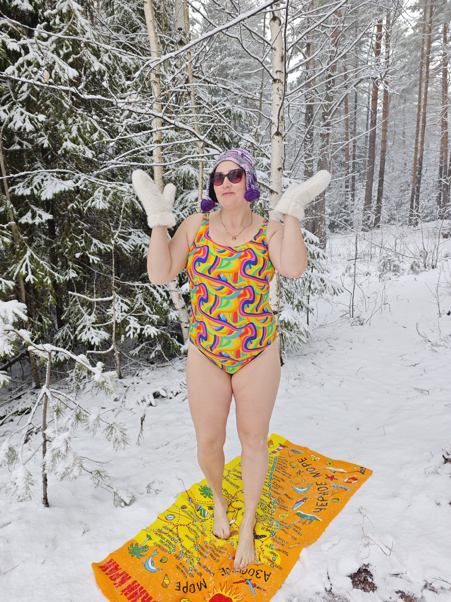 A medium shot captures a woman standing on an orange towel amidst a snowy forest landscape, likely in winter. The woman wears a bright, multi-colored one-piece swimsuit, white mittens, sunglasses, and a knitted hat with purple pom-poms. Her arms are raised, palms facing forward, in a slightly puzzled or celebratory gesture. The towel beneath her feet is printed with Russian text and illustrations reminiscent of a beach scene, contrasting sharply with the snowy environment. The snow covers the ground and branches of the surrounding trees, varying in thickness and density. The backdrop features a forest with a mix of deciduous and coniferous trees, creating a textured, wintry scene. The forest suggests a remote or park-like setting. The OCR text from the image shows Russian words, and includes the city of Марковский in Russia, likely referencing a nearby location.