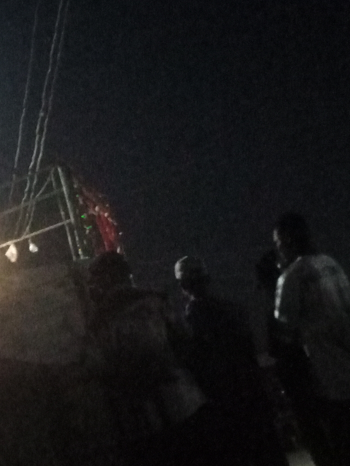 A dark, grainy photograph shows several figures standing near a structure with cables or wires extending upwards. The structure appears to be a frame or scaffold-like construction. The figures are silhouetted against the darkness, with one wearing a lighter-colored shirt. The scene is poorly lit, making details difficult to discern. Some faint green and red colors are discernible on the structure.