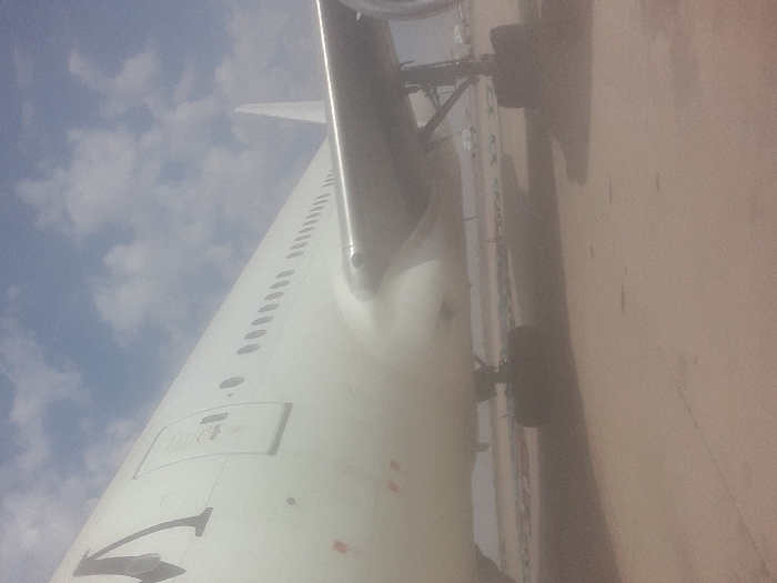 A large, white passenger aircraft is stationary on an asphalt or concrete apron in Aviation Quarters, Nigeria, under a sky with scattered white cumulus clouds. The aircraft's fuselage displays multiple rows of small, circular windows and a prominent passenger entry door mid-section, featuring a visible handle mechanism. A partial black graphic, resembling the letter 'M' or a logo, is visible on the upper forward fuselage. The primary wing extends horizontally from the lower fuselage, with the main landing gear, comprising substantial black tires and structural supports, resting on the ground. A segment of the aircraft's white vertical stabilizer is visible toward the rear. The environment is characterized by a pervasive atmospheric haze or dust, which significantly reduces visibility, particularly at ground level, lending a muted, light-brown hue to the immediate surroundings. Distant background elements are indistinct due to the haze. No personnel or active operations are observed.