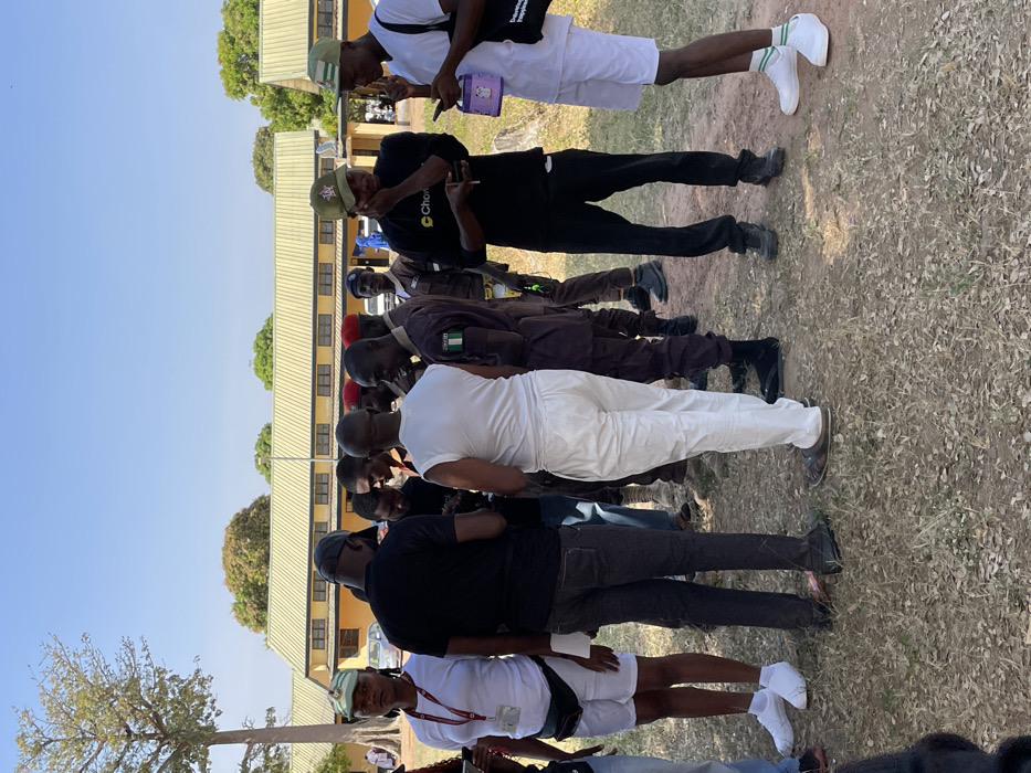 The image captures an outdoor gathering of approximately fifteen individuals in Unguwar Shanu, Nigeria, under a clear blue sky