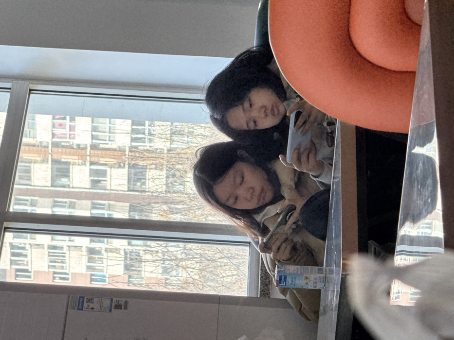 The image depicts an indoor scene in Daxing District, China. Two East Asian females, identified as teenagers, are seated side-by-side at a reflective, dark-surfaced table. The female on the left wears a light brown padded jacket and holds a dark-colored smartphone horizontally with both hands, her gaze fixed on the device's screen. A carton of "Letom Original" beverage is positioned on the table to her left. The female on the right, wearing a light-colored top, similarly holds a light-colored smartphone horizontally, also directing her attention to its display. No interaction is observed between the two individuals. To the far right, an orange, textured, semi-circular object, consistent with a chair back, is partially visible. Through a large window, an urban residential environment is visible. Bare deciduous trees stand in the mid-ground, foregrounding a multi-story apartment building with numerous windows. A white wall section to the left of the window displays a blue and white utility sticker featuring Chinese characters "国网电力" (State Grid Electric Power) and QR codes. The scene is illuminated by natural daylight.
