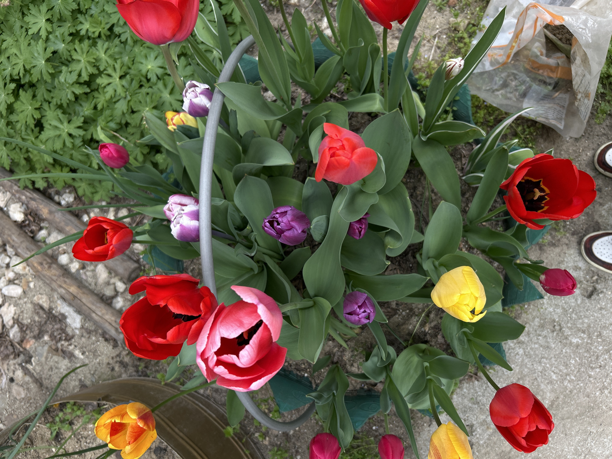 - "The image depicts a collection of colorful tulips in a pot, viewed from directly above" by FM-iOH4g1, licensed under CC BY 4.0