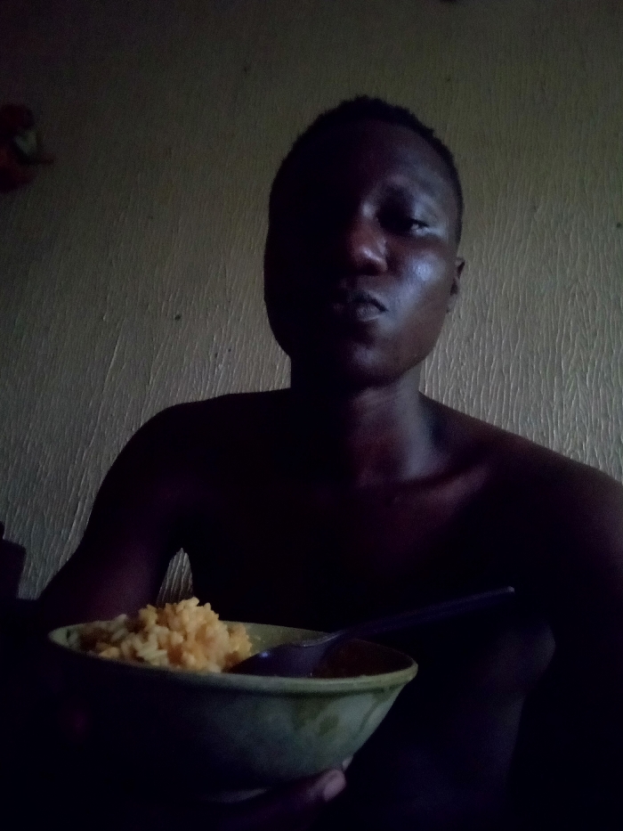 The image displays an individual of dark complexion, with short dark hair and a neutral expression, positioned centrally and looking directly at the camera. The subject, appearing shirtless, holds a light greenish-brown bowl containing yellowish-orange granular food, with a dark-colored spoon resting within the food. Dim, directional lighting from the upper right illuminates parts of the subject's face and the contents of the bowl. The background is a textured, light-colored wall exhibiting subtle vertical striations. A blurry, reddish-orange object is faintly visible in the upper left portion of the background. The scene is located in an interior setting within the city of Unknown, Unknown.