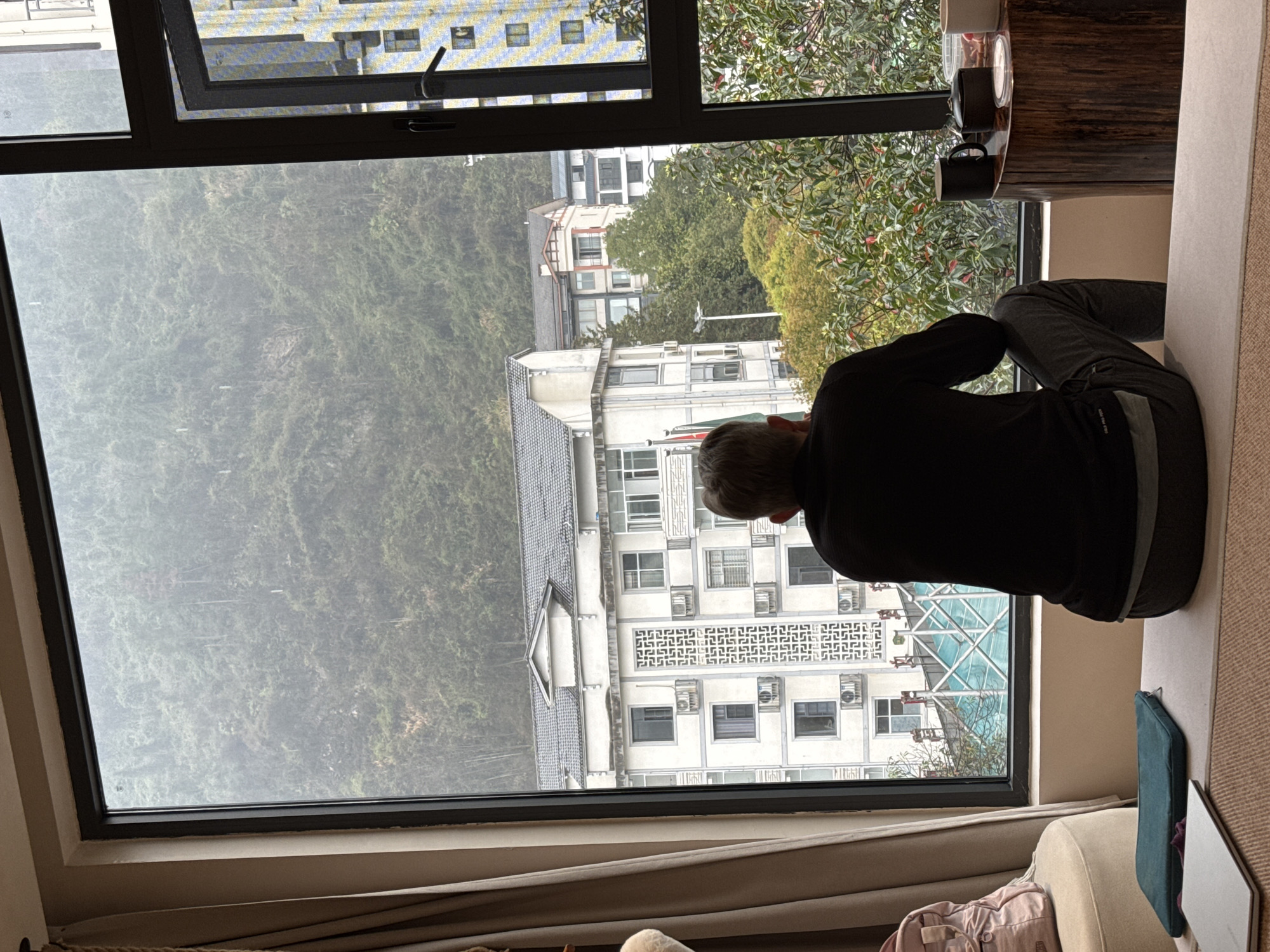 The image depicts an indoor scene looking out a large window onto the city of Wulingyuan, China, and a natural mountain landscape under overcast conditions. In the foreground, a male individual is seated with his back to the viewer, facing the window. He wears a dark long-sleeved shirt and dark pants with a lighter waistband. He is positioned on a light-colored bench or window ledge, which extends to the right. To the left of the individual, a beige ottoman, a pink backpack, a teal laptop sleeve, and a white laptop are arranged on the bench. To the right, on a dark, cylindrical wooden side table, a dark mug, a dark lidded container, a clear plastic container with contents, and a light-colored mug are visible. Light-colored curtains are partially drawn on the left. The window frame is dark; the right section of the window is open inward, revealing a screen or secondary pane. Beyond the window, the midground reveals an urban environment. A prominent multi-story white building with a dark tiled roof and a distinctive geometric patterned facade stands directly across. This building features multiple external air conditioning units and flags on poles. Below this building, a blue-bottomed swimming pool is partially visible, covered by a light-colored, possibly transparent, structure, with indistinct figures around it. Further back, another multi-story building with a tiled roof and balconies is visible. To the far right, a tall building with a blue and yellow grid pattern on its facade is partially seen. Lush green and reddish-leafed trees are interspersed throughout the urban landscape. In the background, densely forested mountains or hills rise, receding into a prominent atmospheric mist or fog.