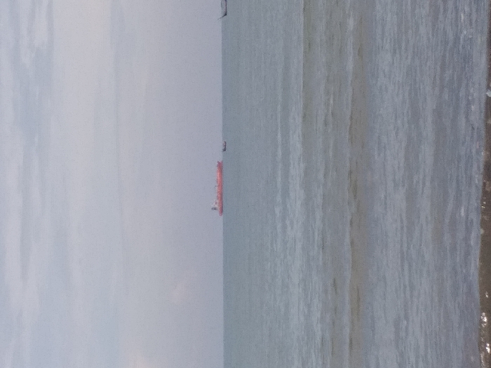 A calm sea meets a sandy shore under a cloudy sky. A distant, red oil tanker sits on the water. The horizon line is blurred, merging sky and sea. The tranquil, subdued colors create a sense of vastness and calm. The texture of the sand and the subtle ripples in the water are visible.