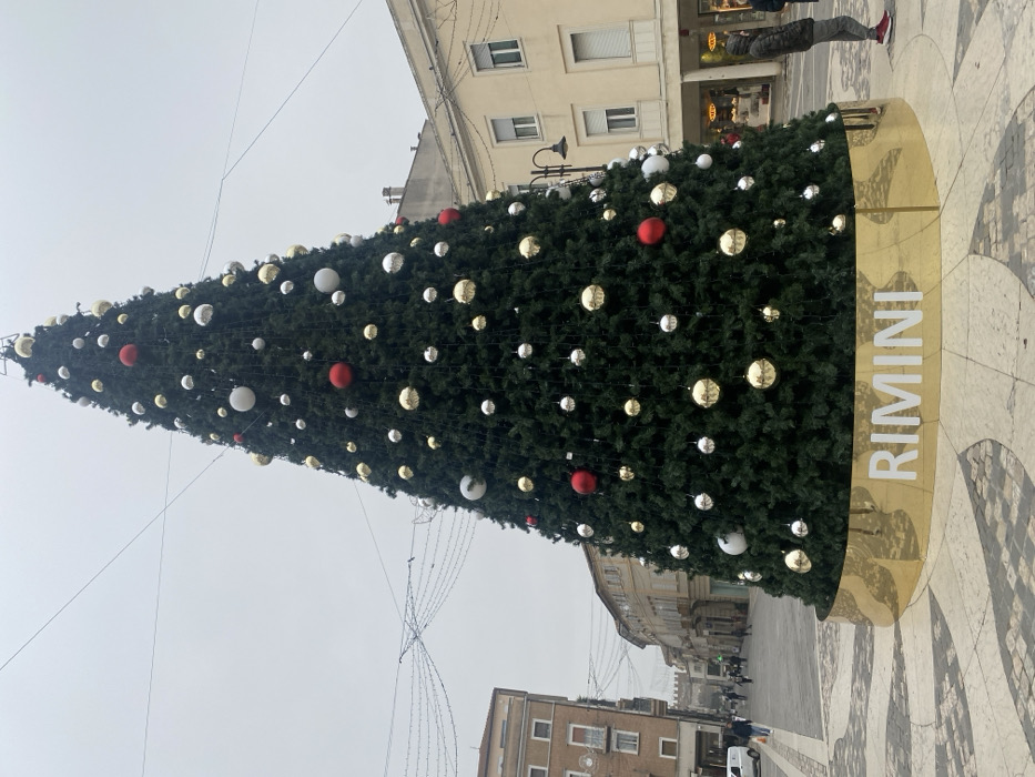- "A large, conical artificial Christmas tree stands centrally in a public square or pedestrian area in Rimini, Italy, under an overcast sky" by FM-jgXHF2, licensed under CC BY 4.0
