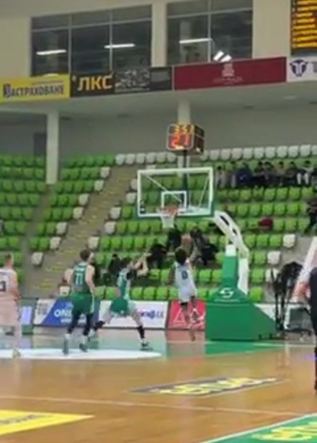 basketball game in progress. Three basketball players are visible, two in green and one in white. A referee in black and white stripes runs alongside them. The player in green shoots the ball towards the basket. A scoreboard displays the game time and score. The court has green and yellow markings. Green stadium seats are partially filled with spectators. Banners with advertisements are visible on the walls.