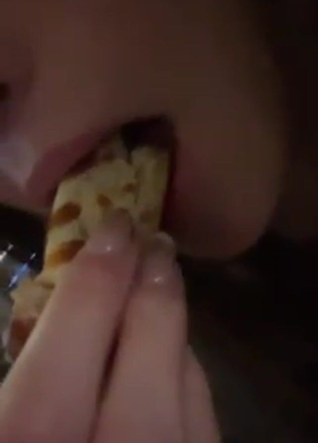 person taking a bite of what appears to be a pastry or breadstick with a reddish-brown sauce on it