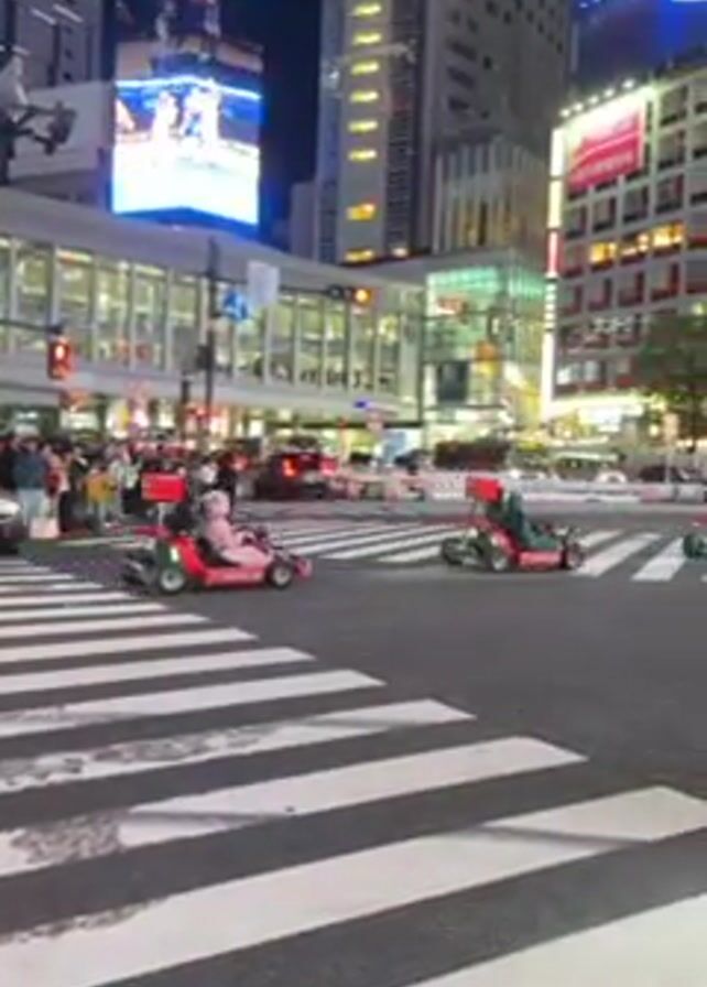 busy city intersection at night. Several go-karts are driving through the crosswalk alongside pedestrian and vehicle traffic. The go-karts are brightly colored, and at least one driver appears to be wearing a costume. Tall buildings surround the intersection, illuminated by large video screens displaying advertisements.