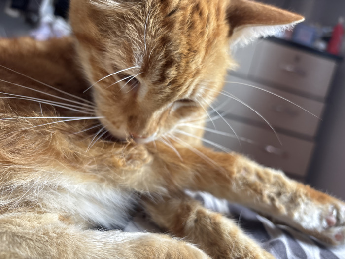 An orange tabby cat is depicted in a close-up, indoor setting within San Juan de Miraflores, Peru. The feline is actively grooming itself, with its head lowered towards its chest/belly area, which displays lighter, possibly white, fur. Prominent white whiskers extend from its snout. The cat's right ear is visible, pointed and upright. Its right front paw is bent, with pink paw pads faintly visible. The animal rests on a grey and white patterned fabric surface. In the blurred background, a light-colored dresser or cabinet with multiple drawer pulls is discernible, alongside a small red object on its surface.