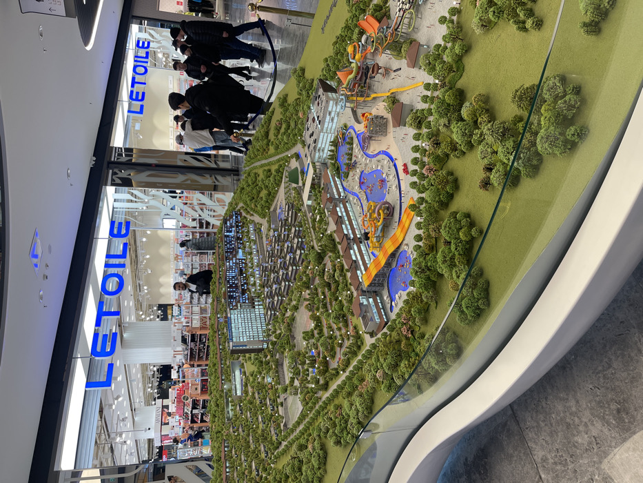 The image displays a large architectural model situated within a modern shopping mall in Tashkent, Uzbekistan