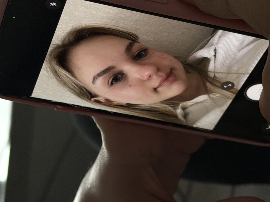 A smartphone, encased in a pink protective cover, is held by an individual, with only their hands and forearms partially visible and out of focus in the foreground, against a dark, featureless background. The phone's screen displays a selfie of a young adult female with light brown hair parted in the middle, dark eyebrows, and fair skin, wearing a light-colored collared shirt. She has a slight, closed-mouth smile and looks directly at the camera. Her background in the selfie is a plain, light-colored wall with subtle vertical texture. The phone's active camera interface is visible, including a large white circular shutter button at the bottom center, a camera-flip icon above it, and a settings icon in the top right corner. A green indicator dot is present near the top left of the screen, suggesting camera or microphone activity. The specific location in the city of Unknown, Unknown, or any city, is indeterminable from the image.