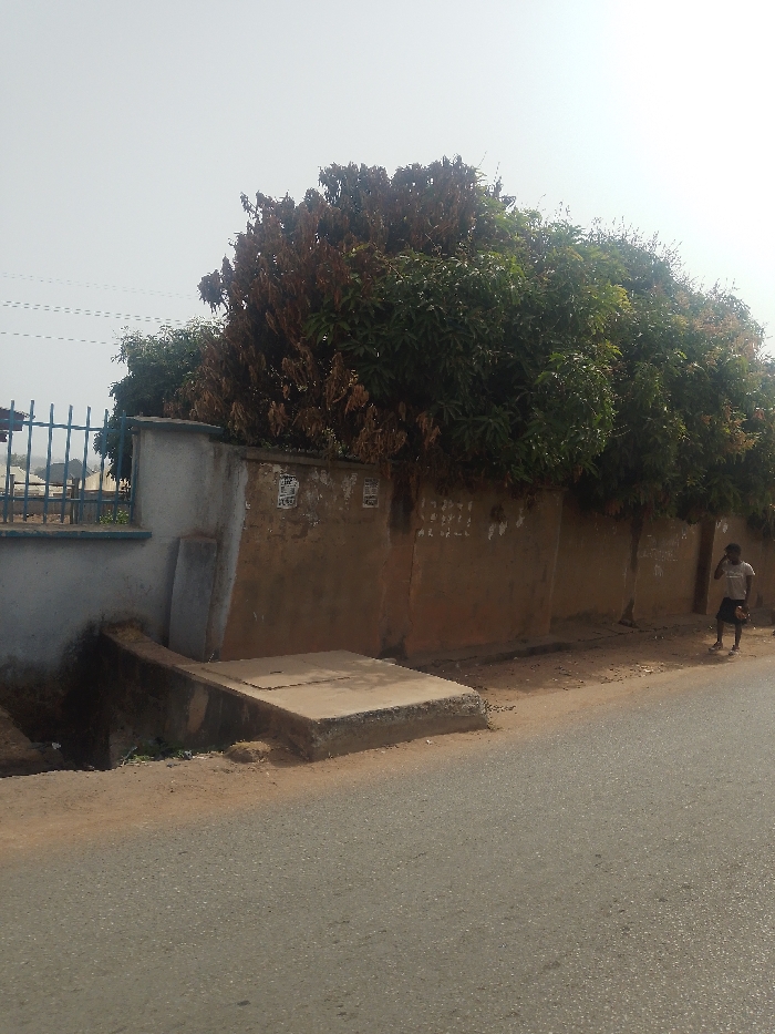 The image depicts an outdoor street scene in Gura Top, Nigeria, under a bright, possibly hazy sky. An asphalt road traverses the lower portion of the frame. Parallel to the road on the right is an unpaved dirt shoulder, bordered by a tall, earth-toned plastered wall, likely a perimeter wall, which displays faded posters and text. Behind this wall, a dense line of trees exhibits both green and brown foliage. In the lower-left, a concrete drainage channel with a square cover extends from beneath a shorter concrete wall topped with a blue metal fence. A single male individual, wearing a light-colored shirt and dark shorts, is visible on the dirt path on the right, appearing to move from right to left, with his lower legs obscured by the frame. Faint utility lines are discernible in the upper-left section of the sky.