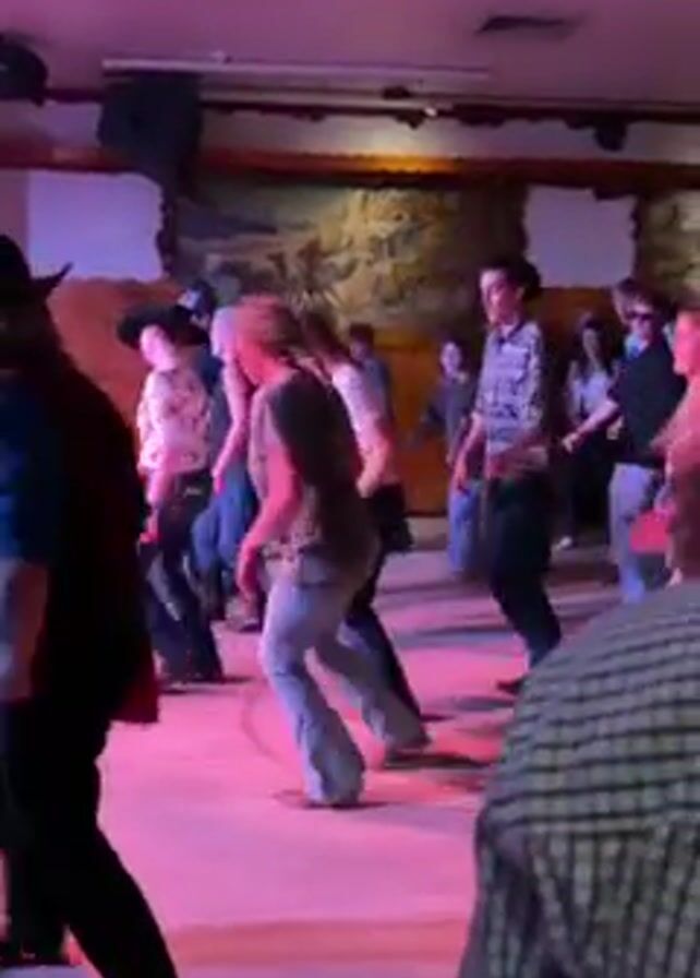 group of people line dancing in a room with a decorated wall. The room is lit with pink and blue lights. The dancers are wearing a variety of casual clothing, and at least one dancer is wearing a cowboy hat. The camera holder appears to be standing in the middle of the crowd.