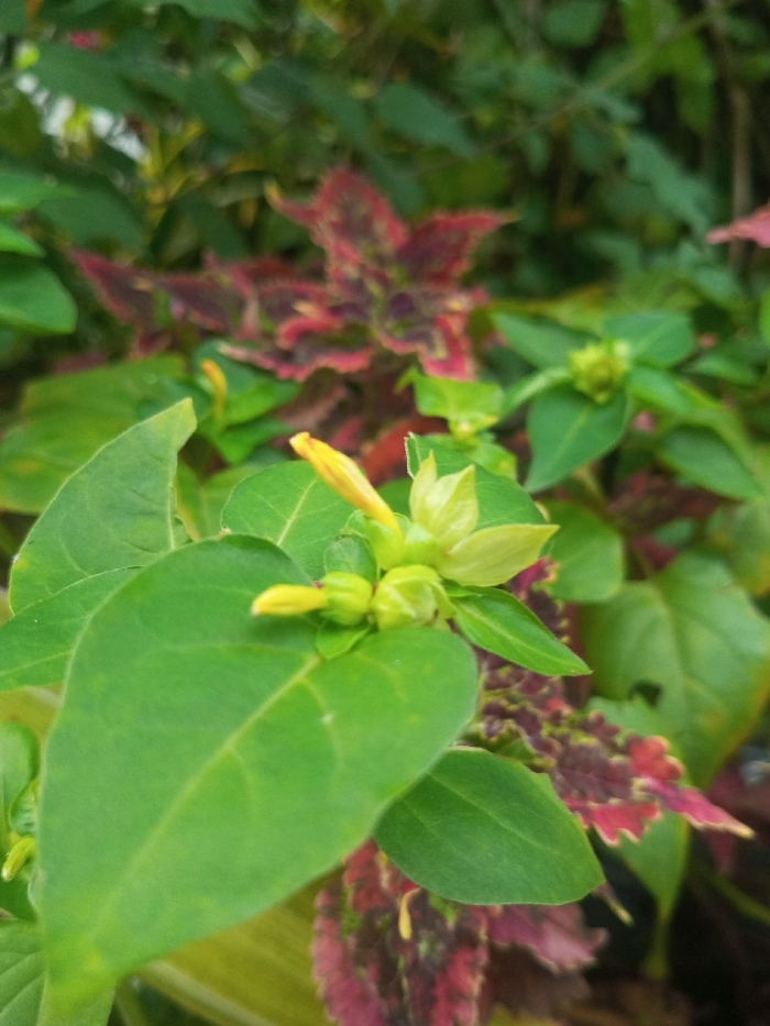 A cluster of Four O'Clock flowers is pictured with buds and a partially open bloom in pale yellow and green. Smooth, ovate green leaves surround the flowers. Behind, a colorful Coleus plant with maroon, red, and green variegated leaves provides a contrasting backdrop. Additional green foliage blurs in the background, creating a soft, natural setting.