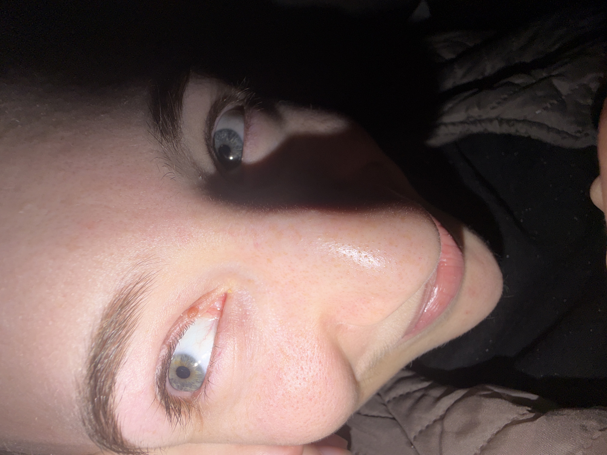 A close-up photograph presents a person's face in a skewed perspective, likely taken from a low angle. The individual's skin is fair with visible pores and freckles. One eye is in sharp focus, revealing a light blue iris with a dark pupil. The eyebrow above this eye is full and light brown. The other eye is partially obscured by shadow. The nose is prominent and slightly shiny, reflecting light. The lips are parted slightly and appear moisturized. A dark shadow dominates the upper right portion of the image. The background includes a dark, quilted fabric. No information indicates this image was taken in Milevo, Bulgaria.