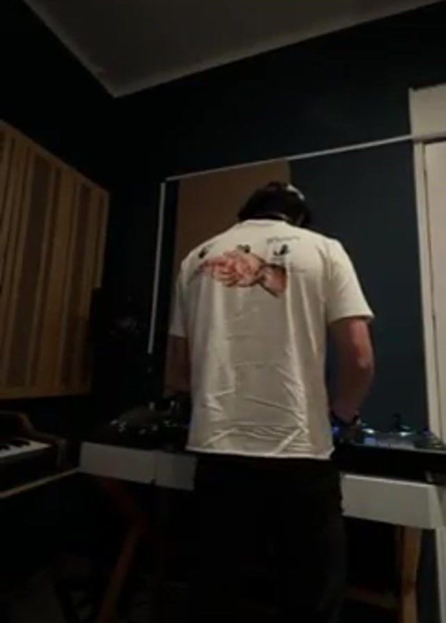 A man is standing behind a DJ setup in what appears to be a home studio. He is wearing a white t-shirt with a graphic on the back and black pants. The studio has dark blue walls, a keyboard, a speaker, and soundproofing panels on one wall. The man has headphones on and appears to be mixing music, as he manipulates the controls on the DJ equipment. The room is dimly lit.
