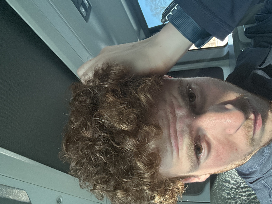 A man with brown curly hair is shown in a close-up selfie, looking at the camera. He has fair skin and a light beard. He's wearing a dark blue jacket and a watch. The background is a car interior, featuring a gray door panel and a window. The image is rotated, making the subject appear sideways. Sunlight illuminates a portion of his face, creating shadows.