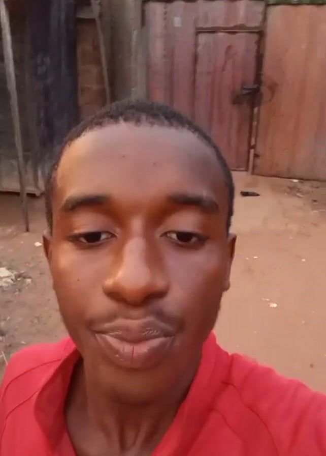 A young man wearing a red collared shirt is recording a close-up video of himself outside. The background includes a wooden shed and a wooden gate, both with a worn appearance. The ground is dirt with scattered debris. The man initially has his mouth open, then closes it and moves his head slightly while looking into the camera.