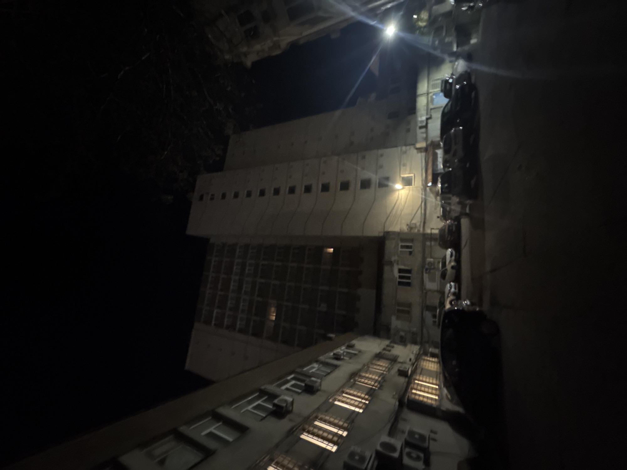 The image depicts a building at night, possibly in an urban setting. The building is tall with a repeating pattern of windows and structures. The bottom of the building shows a flat roof that is peppered with air conditioning units and other equipment. Some light is cast from internal illumination within the building. The view is from a lower vantage point. There is darkness surrounding the left and right sides of the building, and darkness above the building. Due to the obscurity of the image, no people, subjects, actions, or interactions can be defined. The exact location in the city of Pleven, Bulgaria cannot be confirmed.