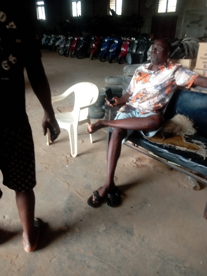 The scene depicts an interior commercial space, likely a motorcycle dealership or repair shop, located in Nnobi, Nigeria