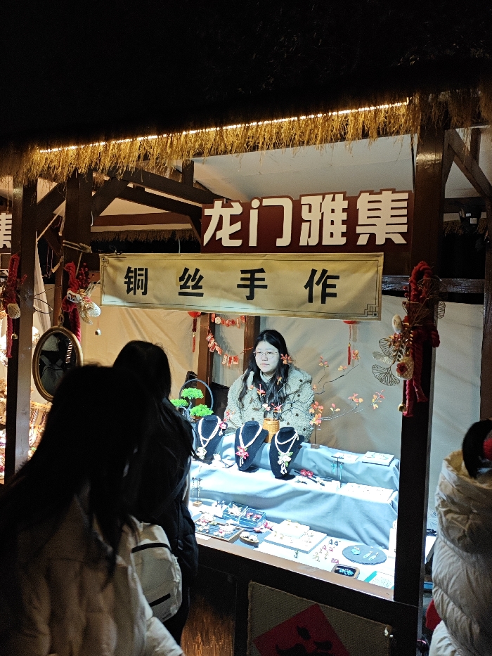 The image captures a nighttime market stall operating in Nan'an District, China. The stall features a rustic wooden structure with dark beams and a thatched-like overhang, which is illuminated by a warm-toned LED strip light. Above the display, two signs are visible: an upper dark brown sign with white Chinese characters "龙门雅集" (Longmen Yaji - Longmen Elegant Collection/Market), and a lower light-colored banner with black Chinese characters "铜丝手作" (Copper Wire Handicrafts/Handmade). A female vendor, with long dark hair and wearing glasses, is seated centrally behind the display counter. She is dressed in a light-colored, possibly patterned, quilted jacket, and several small red origami cranes are draped around her neck/shoulder area. She maintains a neutral expression, looking forward. The display counter is covered with a light blue cloth, showcasing various handcrafted jewelry items. Prominently featured are three black velvet necklace busts, each displaying a pearl-like necklace with a colorful pendant (red, pink, and green). Numerous smaller jewelry items, including earrings and rings, are arranged in clear containers and on small trays across the counter. To the left of the vendor, a circular mirror with a dark frame and a small artificial green potted plant are visible. Behind the vendor, red string decorations with small red envelopes or papers are strung horizontally. The wooden posts of the stall are adorned with decorative red braided ropes, tassels, and metallic leaf ornaments. Two customers are partially visible in the foreground, with their backs mostly turned to the viewer, facing the stall's display. The customer on the left has long dark hair and wears a light-colored jacket, with a white backpack strap visible. The customer on the right is partially obscured, wearing a light-colored puffy jacket. Both appear to be observing the merchandise. The scene is artificially lit, indicating evening or nighttime operations.