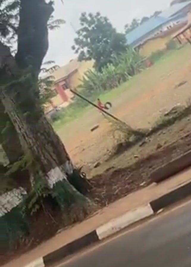 view across a street toward a grassy, fenced-in field on a cloudy day. Two people, possibly children, are visible in the field. They are wearing bright green and moving about, seemingly playing or exercising with tires. One tire appears to be rolling or being carried, while others are stacked or lying around the perimeter of the field along the fence. Buildings are visible in the background behind the field. A large tree with white markings on its trunk is on the side of the road where the video is being shot. The camera is moving.