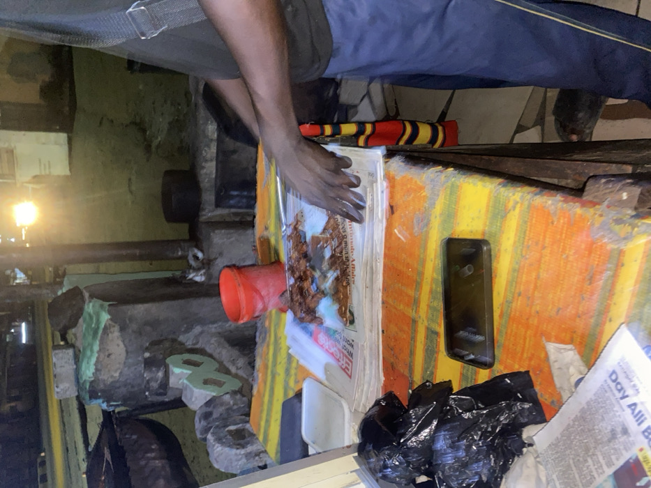 At night in Adankolo, Nigeria, a person with dark skin, wearing a dark shirt and blue pants, stands behind a worn, striped table. Their hands are positioned over a pile of dark, cooked meat-like pieces resting on newspapers. A red plastic bucket sits to the left of the meat. A dark smartphone, a black plastic bag, and additional newspapers are visible on the table. In the background, concrete structures, a large dark pot, and a bright artificial light source illuminate the scene. The environment suggests an outdoor street food stall.