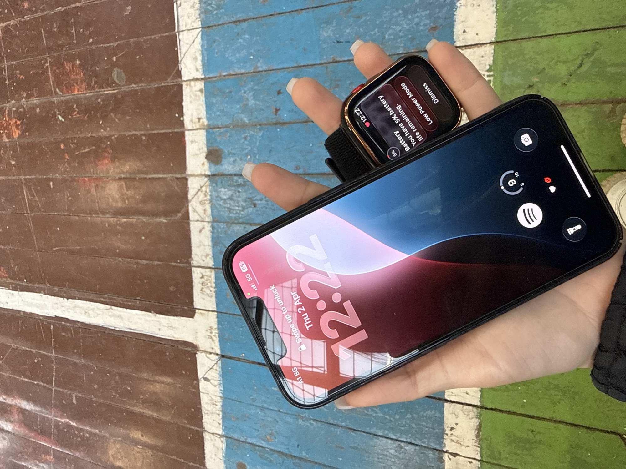 person's hand holding an iPhone and an Apple Watch. The iPhone screen displays the lock screen with the time 12:22, the date Thu 2 Apr, and the message "Swipe up to unlock". The phone also indicates 65% battery life and 5G network connectivity. The Apple Watch screen displays a notification stating "Battery Low Power Mode You have 5% battery life remaining." The background shows a worn surface with brown, blue, and green paint, suggesting an outdoor or urban environment. There is no information available in the picture to provide a more specific location in the city of Cherven Bryag, Bulgaria.
