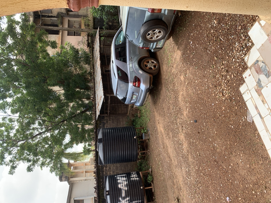The image captures an unpaved outdoor area within a compound in Enugu, Nigeria, under an overcast sky