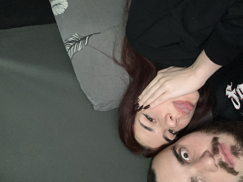 The scene depicts two individuals indoors in Yambol, Bulgaria. A male, visible on the left side of the frame with a partial view of his face, has dark hair, a beard, a mustache, and a piercing above his left eyebrow. His right eye is wide open, directed towards the camera. To his right, a female individual with reddish-brown hair, dark eyeliner, and dark, long fingernails is visible. She is wearing a black long-sleeved garment. Her left hand is pressed against her left cheek, and she is sticking her tongue out, directly facing the camera. The background consists of a plain dark grey wall or surface on the upper left, transitioning to a light grey pillow with white feather patterns on the upper right.