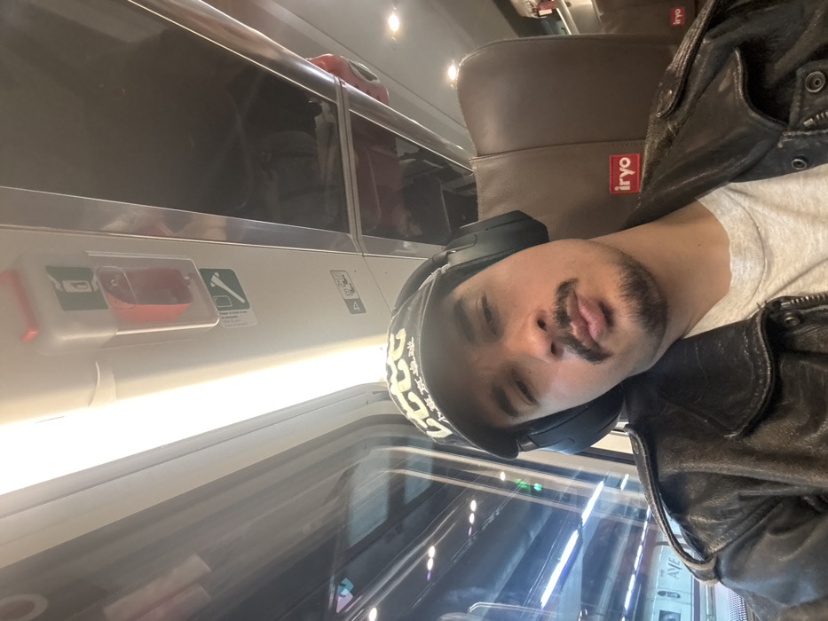 A male individual is depicted in a close-up selfie within the interior of an Iryo high-speed train, positioned at or near the Estación de L'Hospitalet de Llobregat, Spain