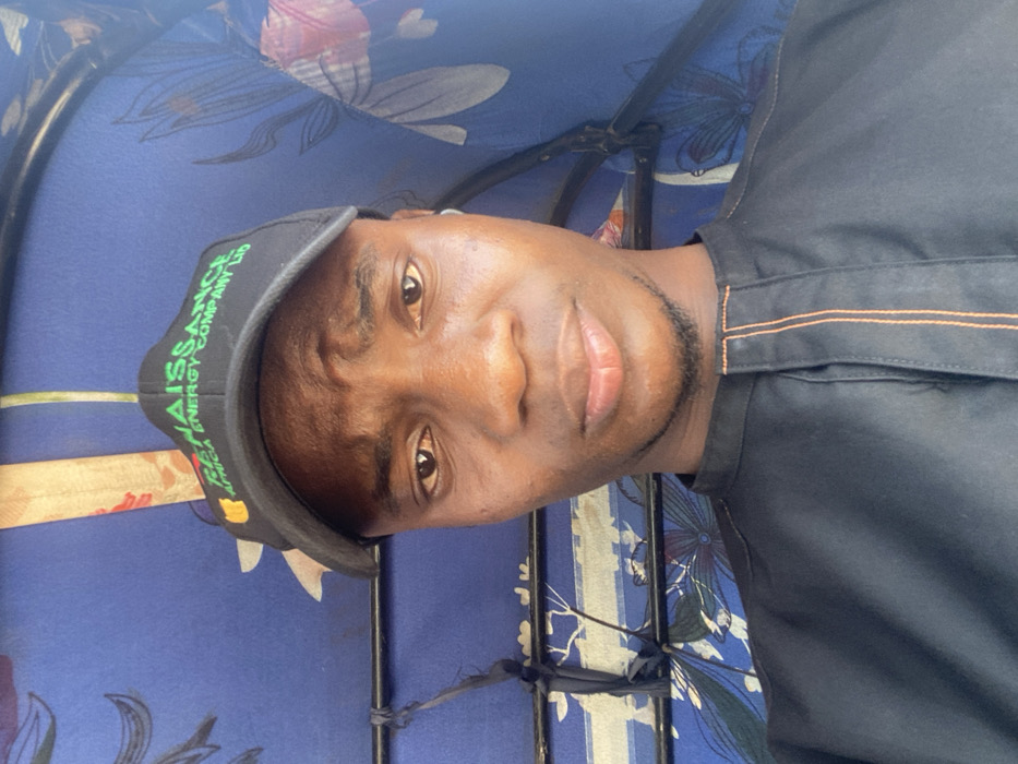 A young adult male, of dark complexion, is depicted in a close-up, chest-up shot. He wears a black baseball cap with the text "RENAISSANCE AFRICA ENERGY COMPANY LTD" printed in white and green, accompanied by a yellow logo. His attire includes a black, collared garment featuring vertical orange stitching along the central placket. A white earbud is visible in his right ear. His expression is neutral, with a slight furrow in his brow, as he looks directly at the camera. The background consists of the interior of a transport vehicle, characterized by a blue fabric canopy with a light floral pattern in darker blue, white, and hints of pink. Structural elements such as black metal tubing, black strapping, and a light-colored wooden slat are visible within the canopy framework. The scene is located in Baganakwo, Nigeria.