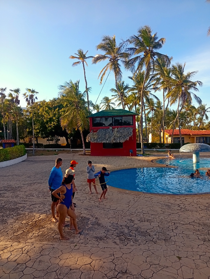 The image captures an outdoor swimming pool area in Playa El Agua, Venezuela. Under a clear blue sky, numerous tall palm trees and green foliage define the background and mid-ground. A two-story red building with a green roof and a thatched canopy above its second-story windows is situated prominently in the mid-ground, with a single-story orange-yellow building visible behind it to the right. In the foreground and mid-ground, approximately ten individuals are present on a light-colored, patterned paved surface surrounding an irregularly shaped blue swimming pool. On the left, a man wearing a blue t-shirt and dark shorts stands next to a woman in a blue one-piece swimsuit. A third person with an orange hat is partially visible. To their right, a child wearing a dark long-sleeved swimsuit and dark shorts is actively using a yellow hula hoop. Another person, dressed in a grey top and red shorts, stands near the pool edge, observing. Within the blue water of the swimming pool, multiple individuals are visible, either wading or swimming. One person is positioned near a mushroom-shaped water feature located on the right side of the pool. Shadows cast by the individuals suggest a low sun angle.