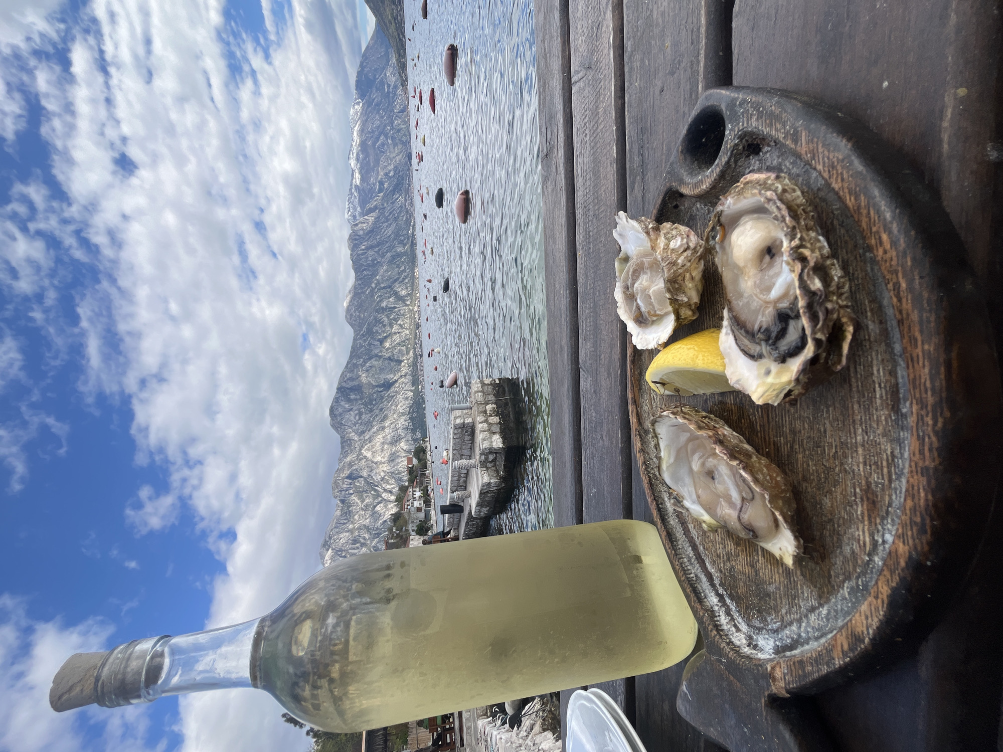 The image presents a table-top view of oysters and a bottle of white wine, set against the backdrop of the bay in Dražin Vrt, Montenegro. The wooden table holds a dark, rustic wooden platter with three oysters (two opened, one with its shell intact) and a lemon wedge. A partially visible bottle of white wine lies horizontally near the bottom of the frame. In the background, the bay of Dražin Vrt is visible, with mountains rising sharply on the opposite side, and the sea with floating buoys. The sky is partly cloudy. No people are seen in the image.