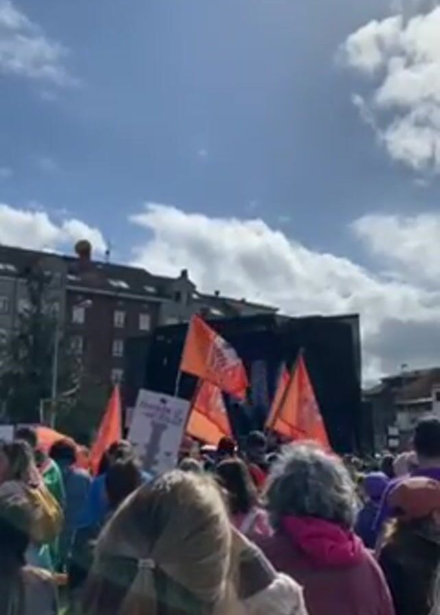 crowd of people gathered in front of a stage, likely at a demonstration or rally. People in the crowd are holding orange flags and signs, one of which appears to have a silhouette of a woman and words in a foreign language. The stage is black with a large letter M visible. The sky is blue with scattered clouds and the sun is shining. The location appears to be an urban area with buildings surrounding the square where the crowd is gathered. A woman's voice can be heard speaking in a foreign language.