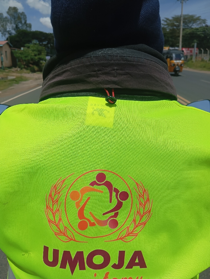 The image depicts an over-the-shoulder view from behind an individual on a paved road in the city of London ward, Kenya. The person in the foreground wears a dark blue beanie, a dark collar, and a bright neon green mesh vest. The vest's back features a prominent reddish-orange logo: four stylized human figures are arranged in a circular formation within a ring, flanked by two curved, branch-like elements resembling wheat or laurel leaves. Below this emblem, the word "UMOJA" is printed in large, reddish-orange capital letters, with additional, partially visible text below it. A red drawstring with a black plastic toggle is visible at the back of the vest's collar. The environment consists of a paved road with a white solid line on the left edge, extending into the distance under a partly cloudy blue sky. A dirt verge with sparse vegetation borders the road. In the background on the left, a building with a reddish-brown roof and light-colored walls is partially visible amidst green trees and bushes. Further down the road, an orange three-wheeled vehicle is traveling away from the viewer. Utility poles or posts line the right side of the road in the middle distance. No direct interactions between individuals are discernible.