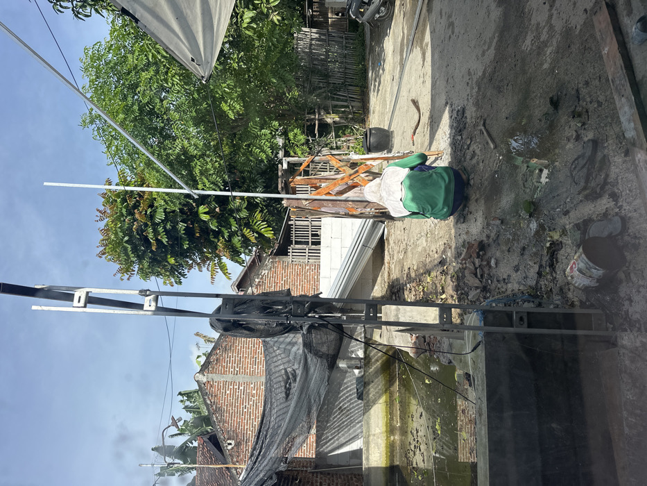 A scene outdoors shows a person kneeling on a concrete surface beside a partially constructed or repaired wooden structure. The person wears a green shirt and light-colored hat. In the background are trees, buildings, and a metal fence. Above, a white tarp is stretched, and a metal pole extends toward the sky. Scattered debris is on the ground next to a paint can. The image is slightly tilted.