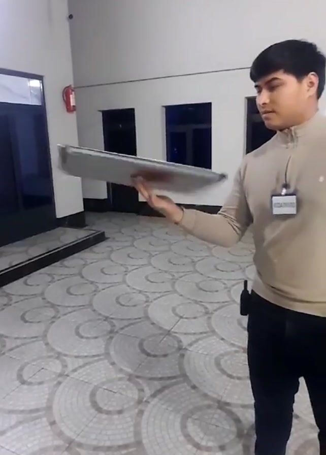 A young man wearing a light brown long-sleeved shirt and black pants stands indoors. He holds a large, rectangular, silver metal tray, twirling it at first and then holding it stationary in front of him. The room has a tiled floor with a circular pattern, white walls, and several windows, some covered and some revealing a dark exterior. A fire extinguisher is mounted on the wall. The man wears a name tag and what appears to be a small radio device on his belt.