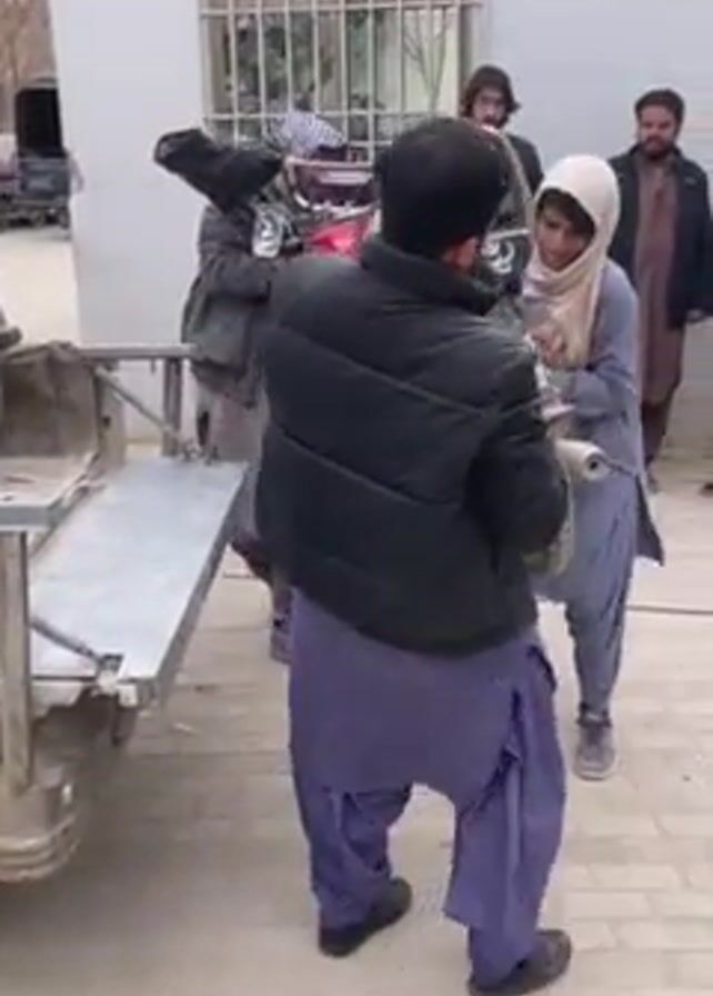 group of men working together to lift a motorcycle onto the back of a small flatbed trailer. One man, wearing a black puffer jacket and purple shalwar kameez, is positioned behind the motorcycle, lifting and guiding it. Another man, wearing a brown jacket and a white and gray scarf, is assisting with the front of the motorcycle. A woman in a light blue shalwar kameez and a hijab stands nearby. There are three more men watching the action. The setting appears to be an outdoor area paved with bricks. A white building with a barred window is visible in the background, and other motorcycles are parked nearby. One of the men in the background is on a cell phone.