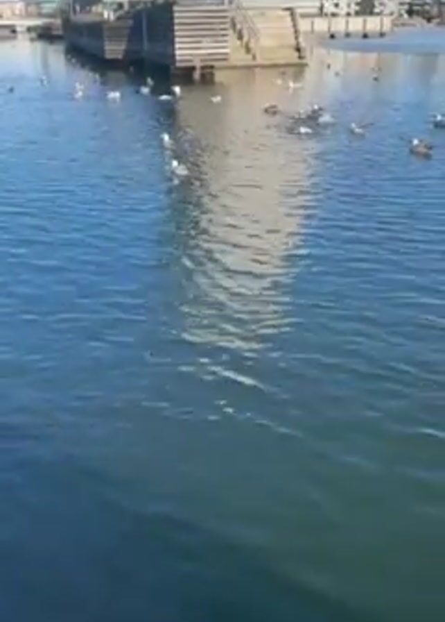 body of water with seagulls swimming in it. In the background is a gray building with a statue on a platform in front of it. The building is tall and angular, with a modern design. The sky is blue and clear. The water is calm, and the sun is shining on the surface, creating a shimmering effect.