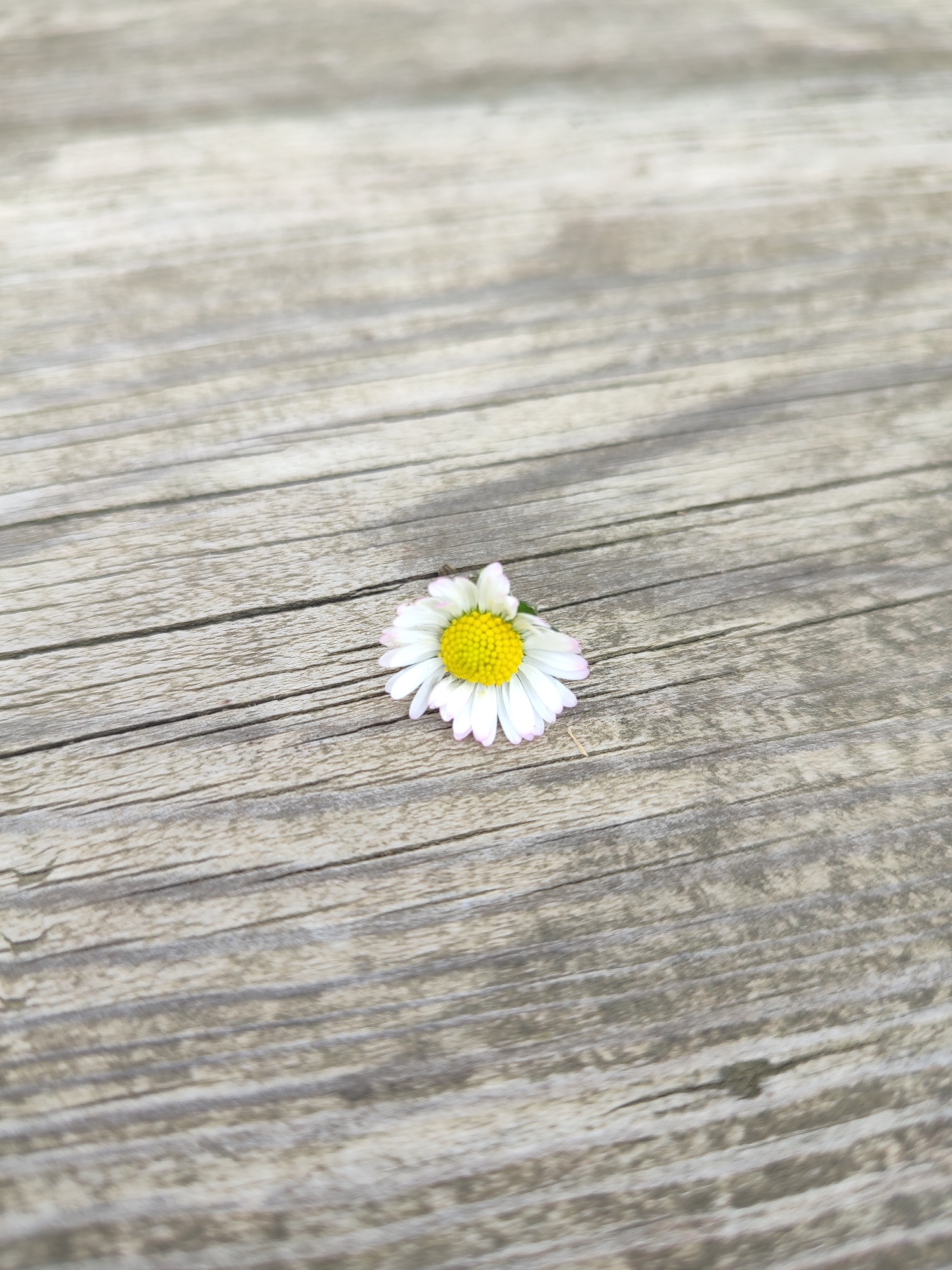 A single common daisy (Bellis perennis) is depicted resting on a weathered wooden surface in Bestuzhevskoye, Russia. The flower, positioned slightly below the center of the vertical frame, features white ray florets with pale pink tips and a bright yellow disc floret center. The wooden surface comprises multiple light grey-brown planks with visible grain, exhibiting a worn texture and minor cracks, running horizontally across the image. The planks appear aged and slightly discolored. Shadows are subtly cast on the upper portion of the wooden surface, indicating natural lighting. No individuals, further subjects, or specific actions beyond the flower's static placement are observed.