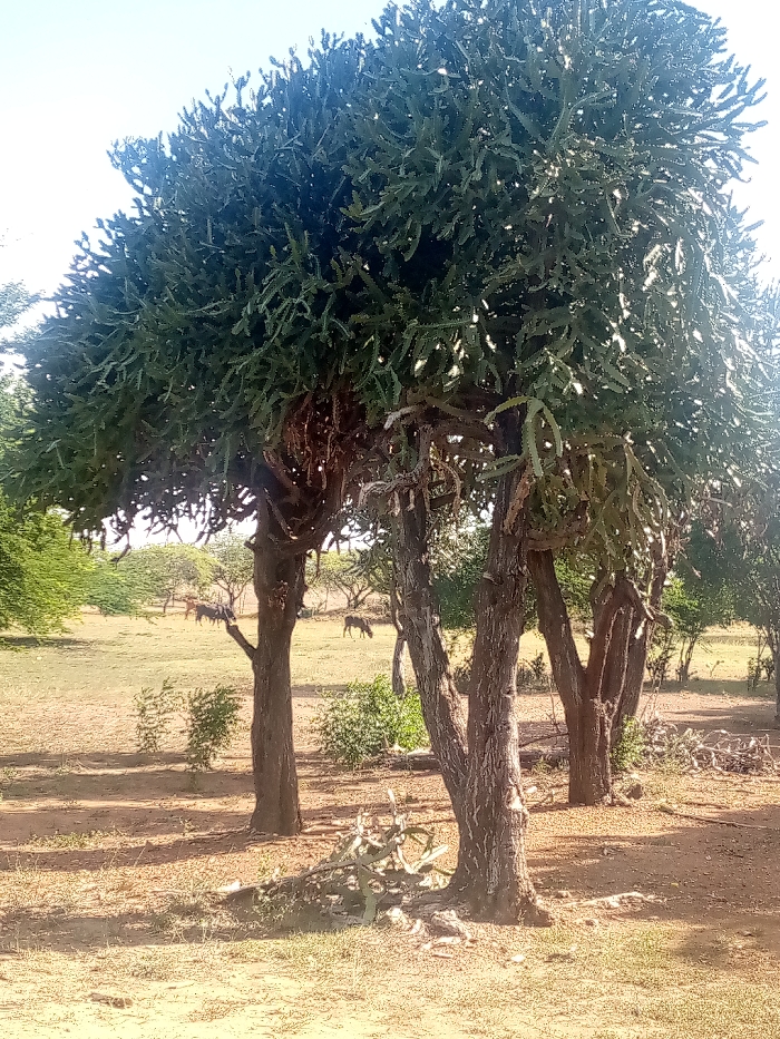 A broad-canopied tree with interlaced green branches dominates the frame. Its trunk splits into multiple stems, creating a dense, intricate canopy. Underneath, the ground is barren and sandy with scattered vegetation and fallen branches. In the distance, a field is visible, populated by a few grazing animals under a bright sky. Other sparse trees dot the landscape.