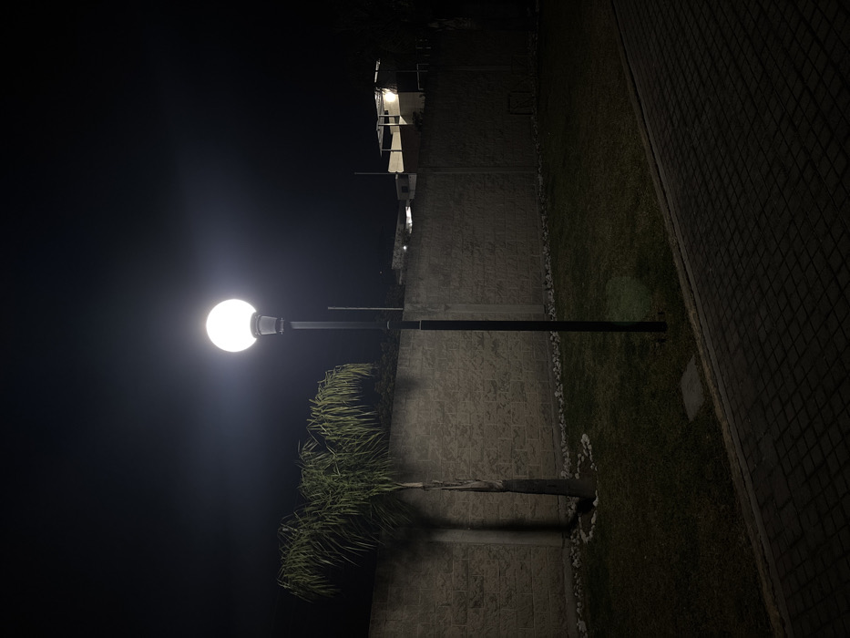 At night, a streetlamp illuminates a scene with a palm tree casting a shadow against a patterned brick wall. Adjacent to the wall is a patch of grass leading to a brick pathway. In the background, a building with lit balconies can be seen. The sky is dark and clear.