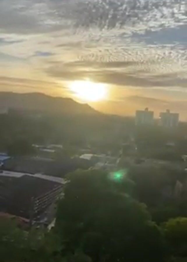 sunrise over a cityscape with a mountain in the background. The sky is filled with wispy, patterned clouds. The sun is bright, casting a warm glow over the buildings and trees below. A hand briefly appears at the beginning of the video, framing the scene. The video pans slightly to the right.
