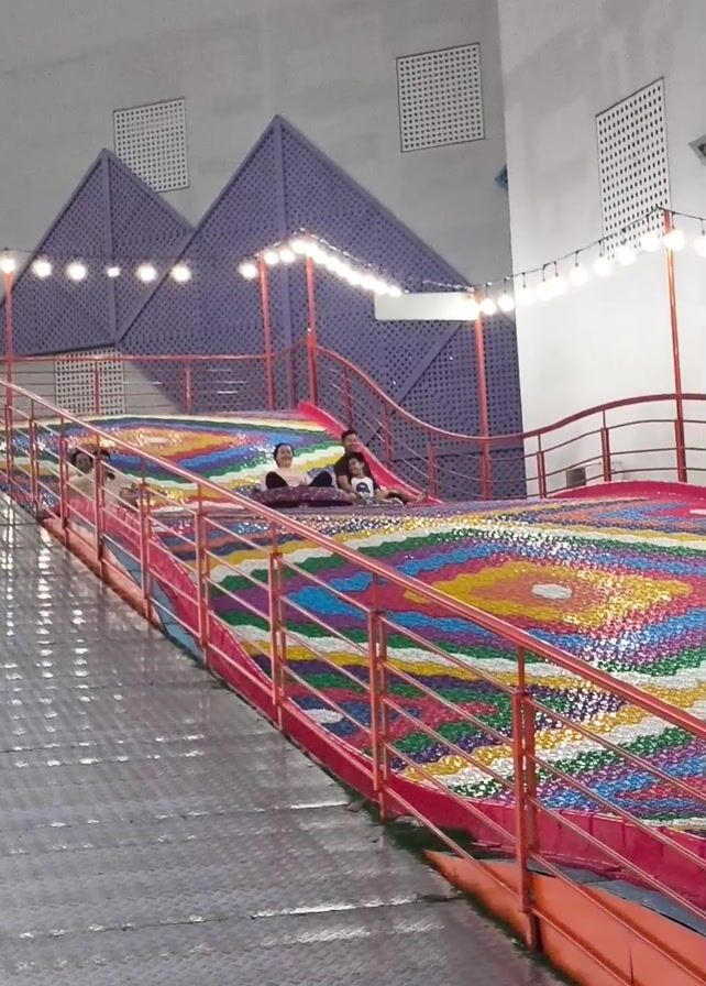 In an indoor recreation area, a family is riding down a colorful, artificial slide using inflatable tubes. The slide is brightly colored with a pattern of multicolored, mosaic-like tiles and is lined with pink and red railings. A woman in a pink shirt and black pants is in one tube. A man and a young child share another tube and are positioned slightly above and behind the woman. The background features geometric designs painted on the walls, rows of square ventilation openings, and strings of lights. The surface surrounding the slide appears to be metal. After sliding down, the woman in pink is seen from behind as she looks back at the camera. A man in a white shirt, possibly an employee, is visible in the foreground.