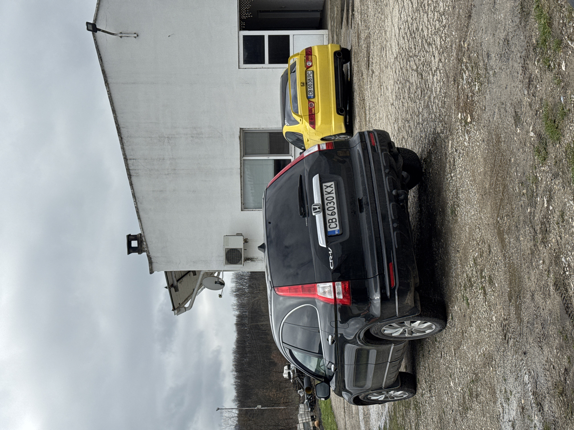 The photograph depicts a black Honda CR-V and a yellow Honda Integra parked adjacent to a white building. The CR-V has a license plate that reads "CB 6030 KX". The Integra’s license plate number is "CB 0038 PC". The setting is outdoors, likely a parking area, with a cloudy sky overhead. The ground appears to be gravel or a similar unpaved surface. The location is the city of Buria, Bulgaria.