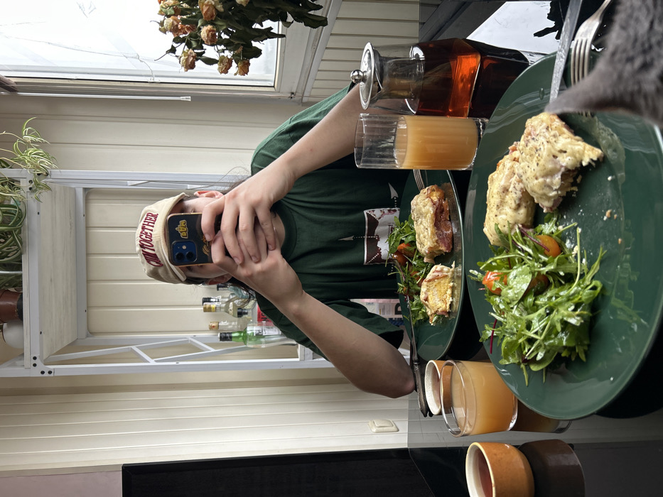 An individual is seated at a dark, reflective table in an indoor setting, holding a dark-colored smartphone with both hands to photograph the meal in front of them, obscuring their face. They are wearing a dark green t-shirt and a light-colored baseball cap with "CUM TOGETHER" embroidered in red capital letters. Two dark green plates each hold a serving of green salad with cherry tomatoes and two portions of a savory dish resembling Eggs Benedict, topped with a white sauce. Two glasses of light orange juice and two small brown ceramic cups of a dark reddish-brown liquid are on the table, along with a clear glass teapot containing the same dark liquid. A grey domestic cat's head is partially visible in the bottom right corner, facing one of the plates. The background features a white metal shelving unit against a light-colored, vertically paneled wall. The shelves display several bottles of alcohol on a lower shelf and potted plants on the top shelf. A large dark rectangular object is partially visible on the left. A window on the right provides natural light, and a vase of dried light brown-orange roses sits nearby. The specific location in the city of Dnipro, Ukraine, cannot be determined from the visual information provided.
