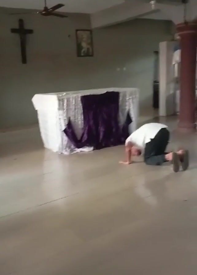 A man is kneeling in prayer in what appears to be a church. The man has his back to the camera, he is wearing a white t-shirt, dark pants, and sandals. He is kneeling in front of an altar that is covered with a white cloth and purple draped fabric. On the wall behind the altar is a cross and a picture. The room has tiled floors, a ceiling fan, and a pillar.