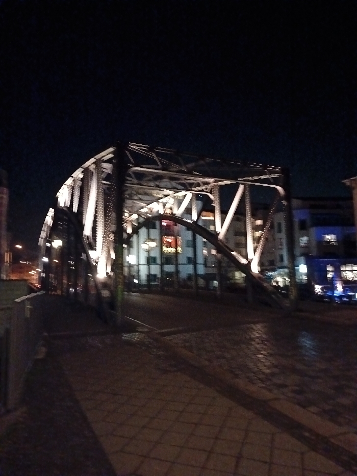 An iron arch bridge illuminated by lights at night is shown. A building with lighted windows is visible through the bridge's structure. The foreground consists of a brick-paved surface, reflecting some light. The sky above is dark, and the overall scene appears to be taken during twilight or at night.